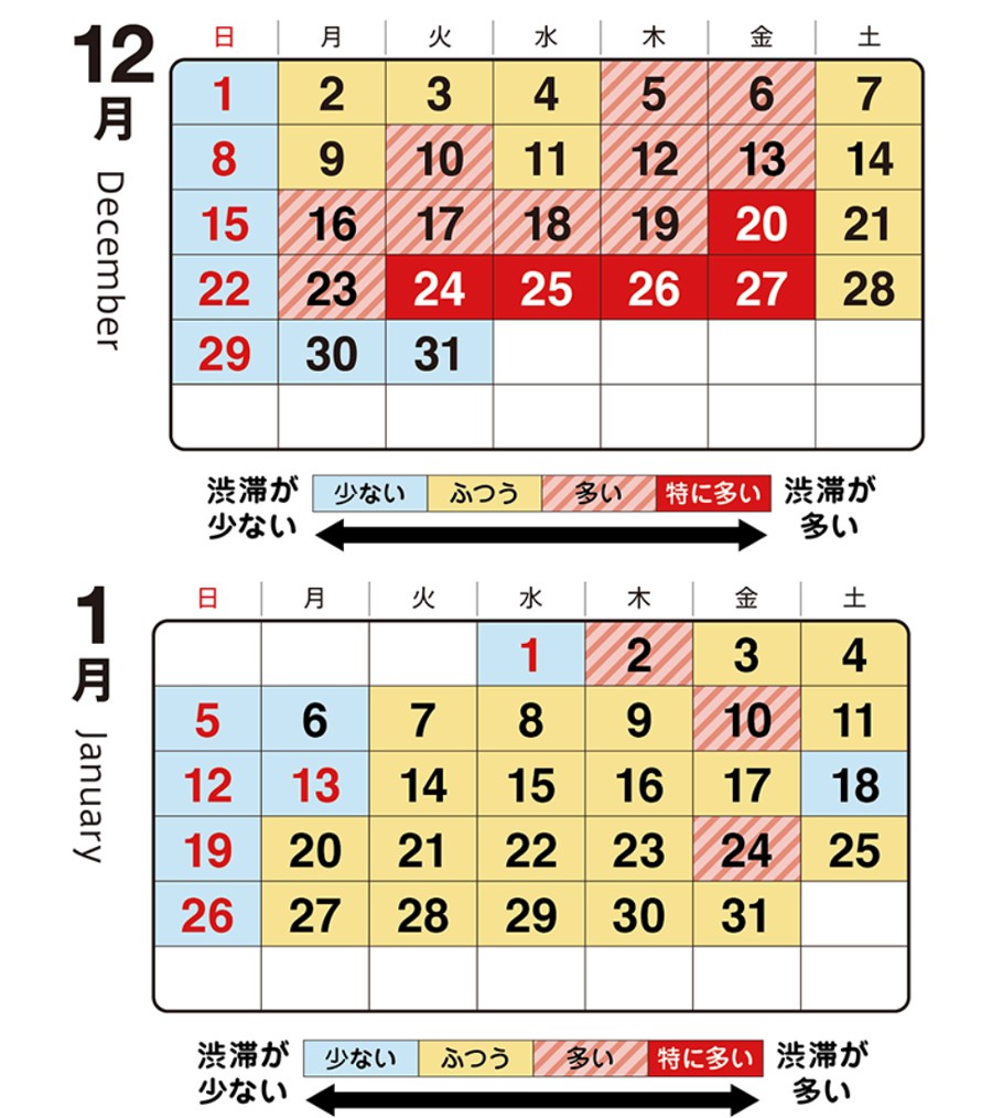 年末年始では、特に1月2日(木曜)~4日(土曜)に渋滞が多発します。