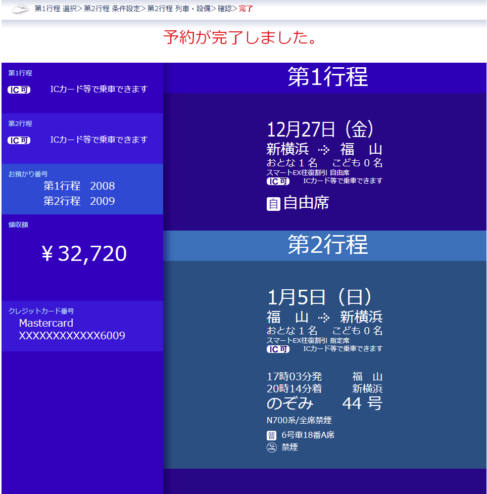 第1行程 12月27日(金) 新横浜 → 福山 スマートEX往復割引 自由席 おとな:1名分 ¥15,830円
