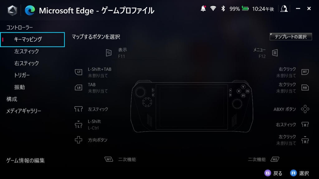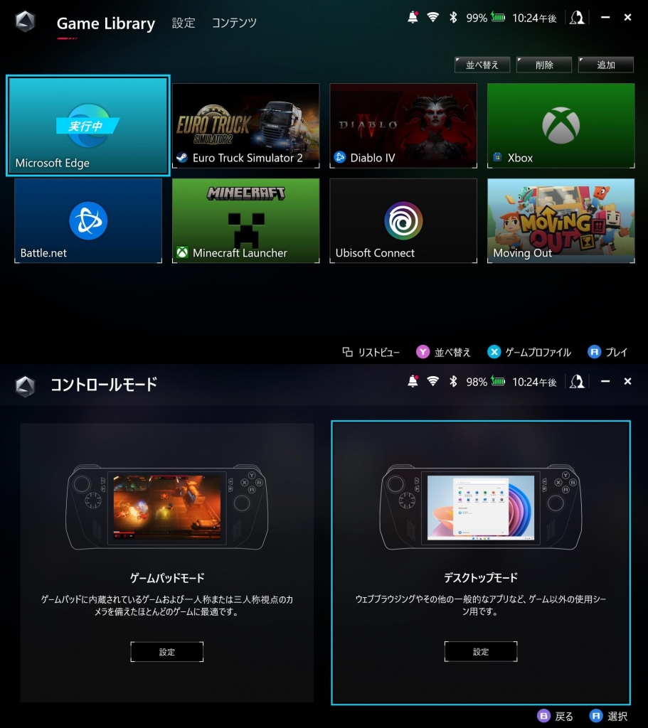 自動的に正しいコントロールモードを選択し、そのゲームに設定しているゲームプロファイルを適用します。ゲームプロファイルを設定していない場合でも、そのゲームがゲームライブラリに表示されている場合、デフォルトでゲームパッドモードを適用します。ウェブサイトを閲覧している場合は、右ジョイスティックを動かすと自動的にデスクトップモードに切り替わります。
