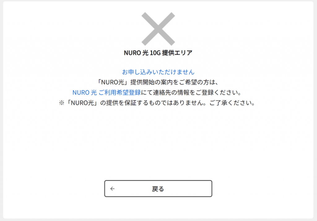 お住まいの地域は NURO 光 10ギガ 提供エリア に含まれていないようです。