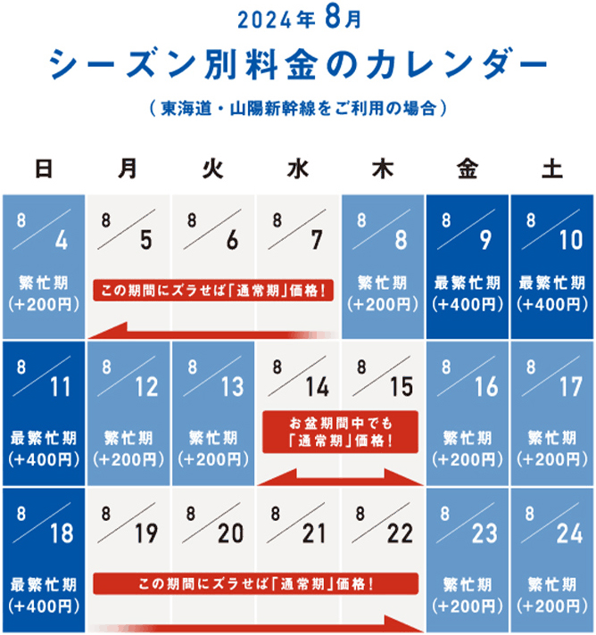 新幹線を含む特急列車の指定席特急料金は、シーズン別におねだんが異なります。