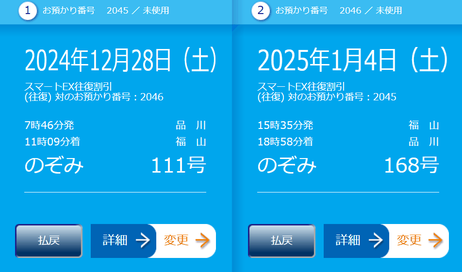 スマートEX往復割引なので行と帰りが同じ駅になります。